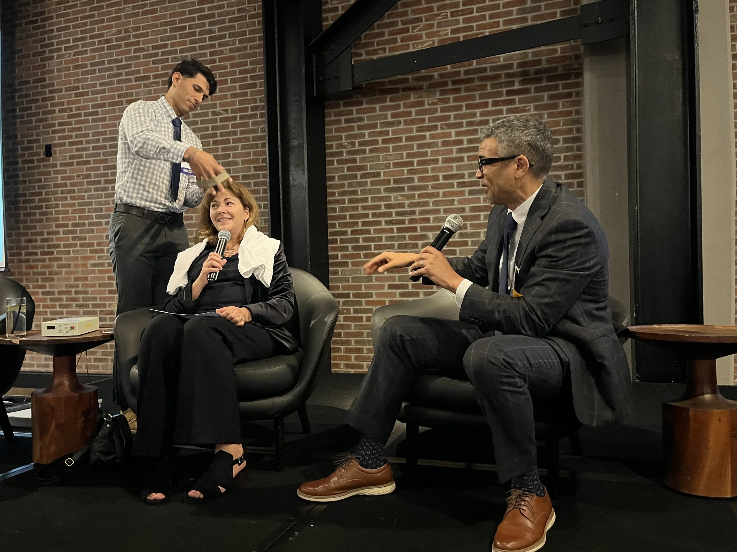 Maiken Scott, host of the evening, getting fitted with an electrode headband as program guest, Dr. Roy Hamilton, explains how brain stimulation works.
